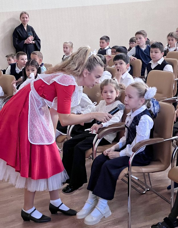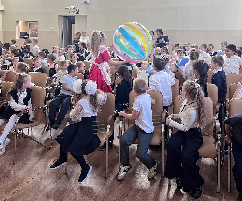 Весёлые персонажи превратили обычный понедельник для первоклашек в яркое приключение. Никто не сидел на месте! И танцевали под необычный прогноз погоды, и шумели от души, и даже в «горячую картошку» сыграли!